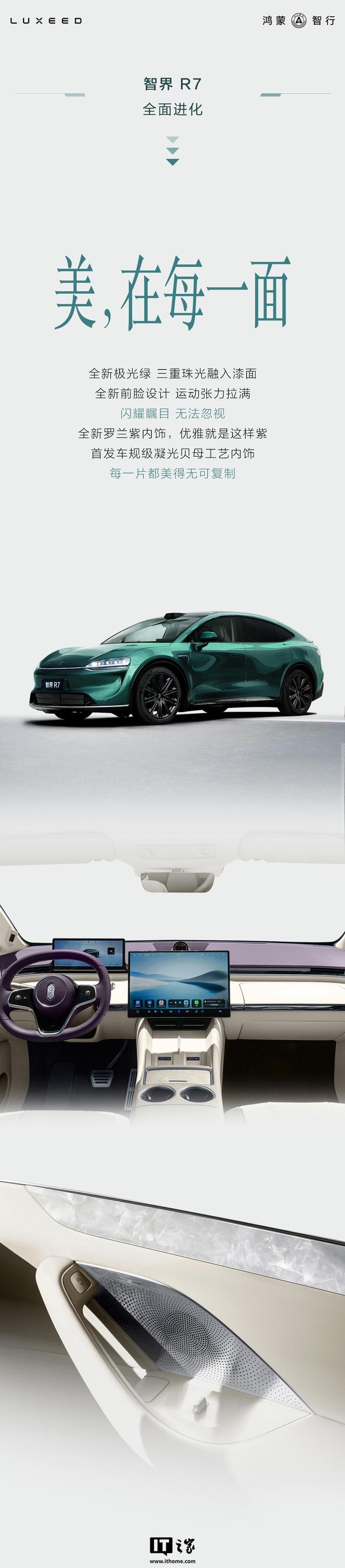 ▲ 图源:华为商城官网 | 新款智界 R7 纯电 / 增程 Max 版选配新款智界 R7 升级亮点如下:
