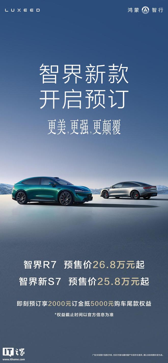 IT之家 8 月 10 日消息,鸿蒙智行智界新款双 7(R7 / 新 S7)车型已开启预订。新车宣称“更美、更强、更颠覆”,预售价 25.8 万元起。参加预订可享 2000 元订金抵 5000 元购车尾款权益。