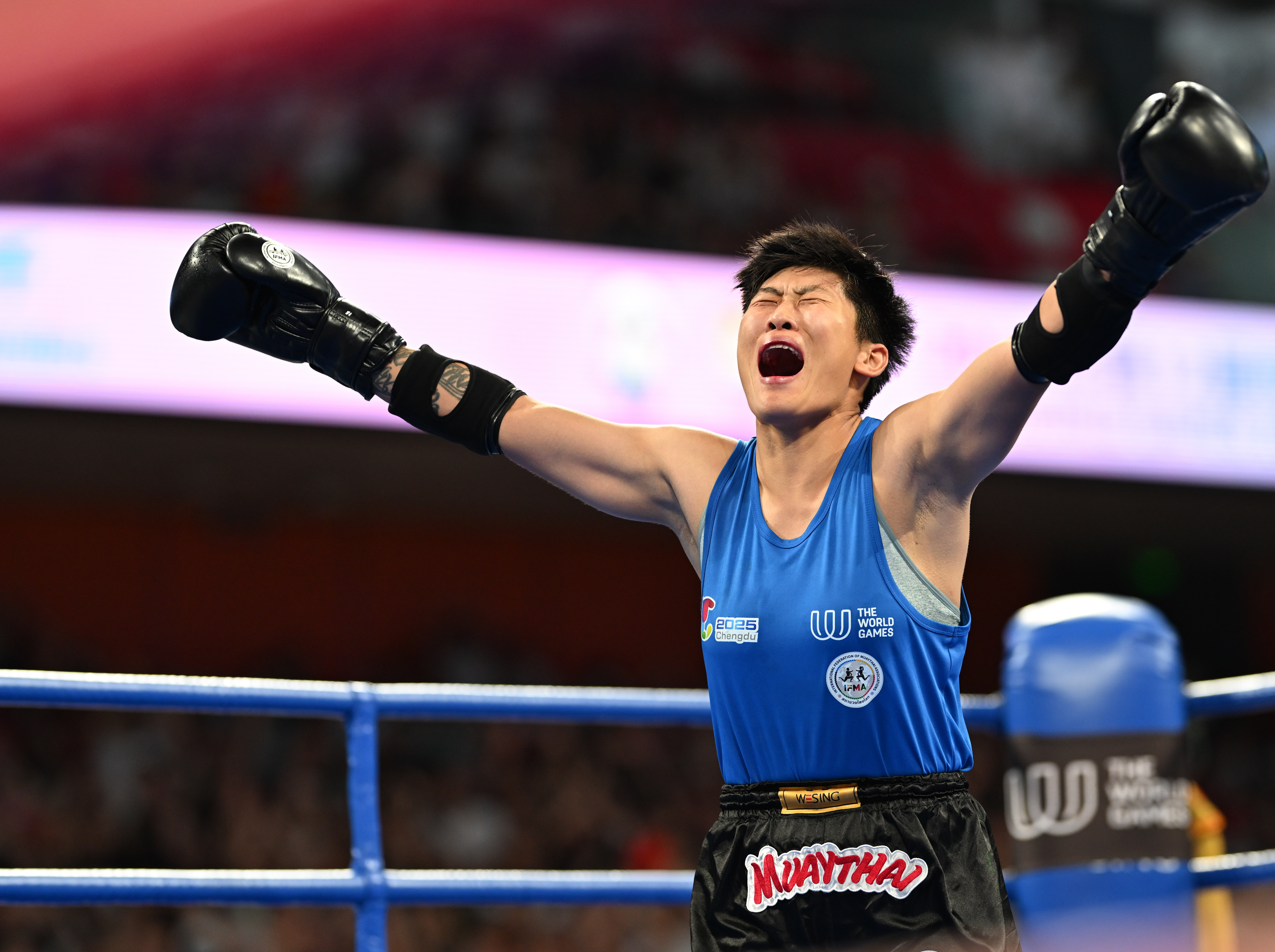 8月10日,韩鑫在夺冠后庆祝。当日,在2025年成都世运会泰拳女子60公斤级金牌赛中,中国选手韩鑫夺得冠军。新华社记者 张博文 摄