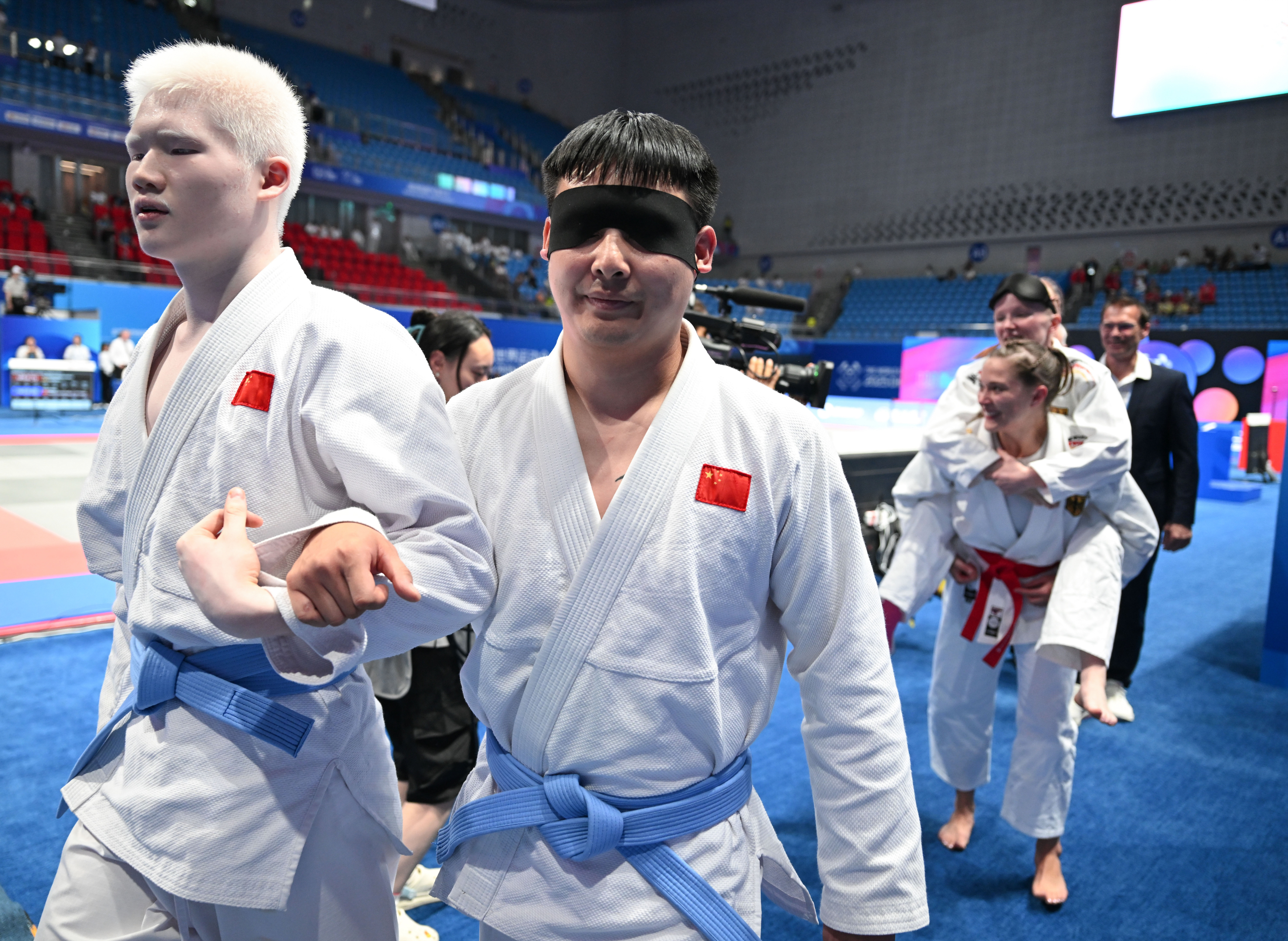 8月12日,中国组合潘天佑(左)/王文强在比赛后。当日,2025年成都世运会视力残疾混合双人柔术决赛举行,德国组合胡内克/帕什凯维奇夺冠,中国组合潘天佑/王文强获得亚军,哥伦比亚组合莫拉/卡斯蒂略获得季军。新华社记者 冯开华 摄