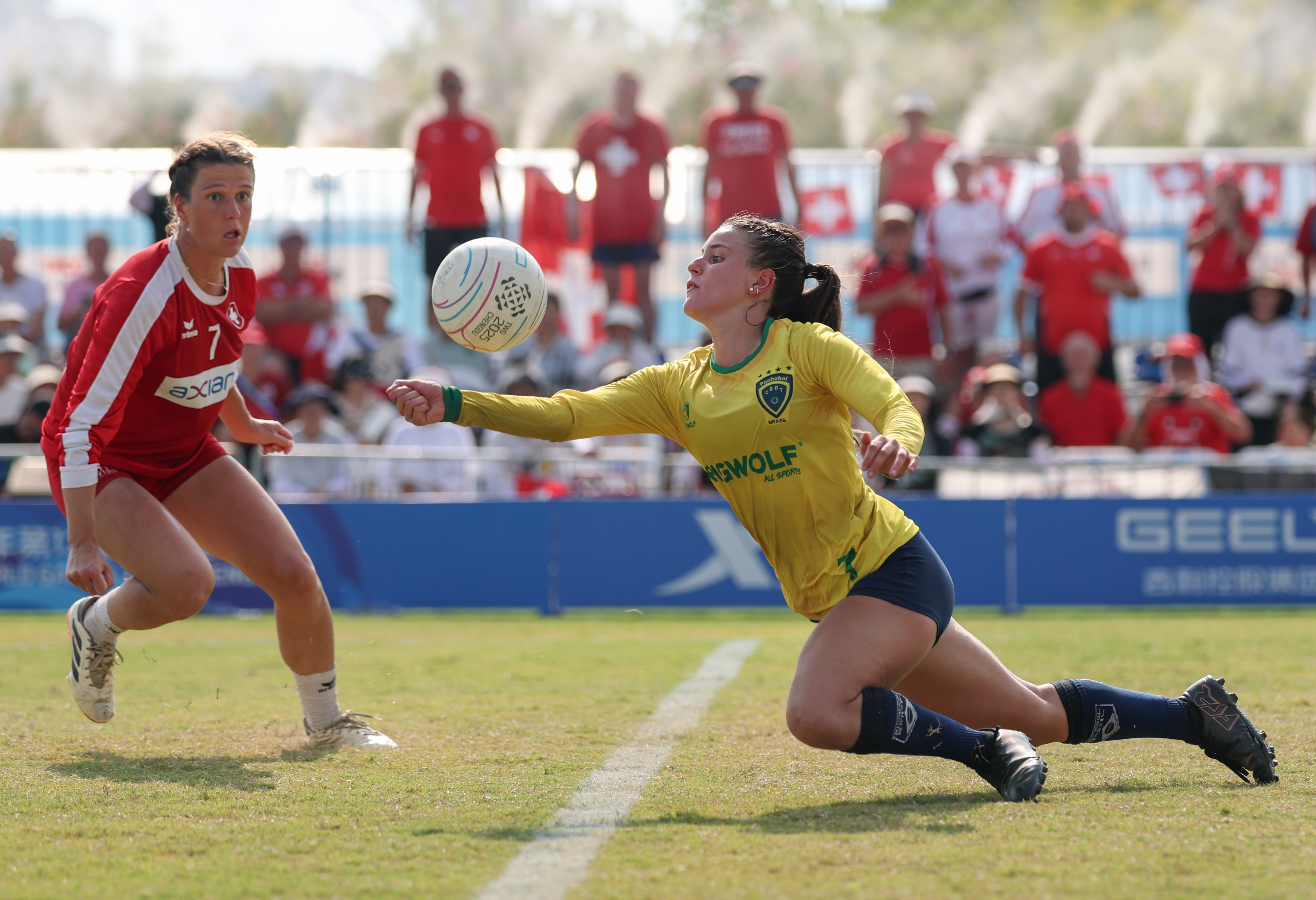 8月13日,巴西队球员茱莉亚(右)在比赛中。当日,在2025年成都世运会浮士德球女子决赛中,巴西队战胜瑞士队,获得冠军。新华社记者 陈诚 摄