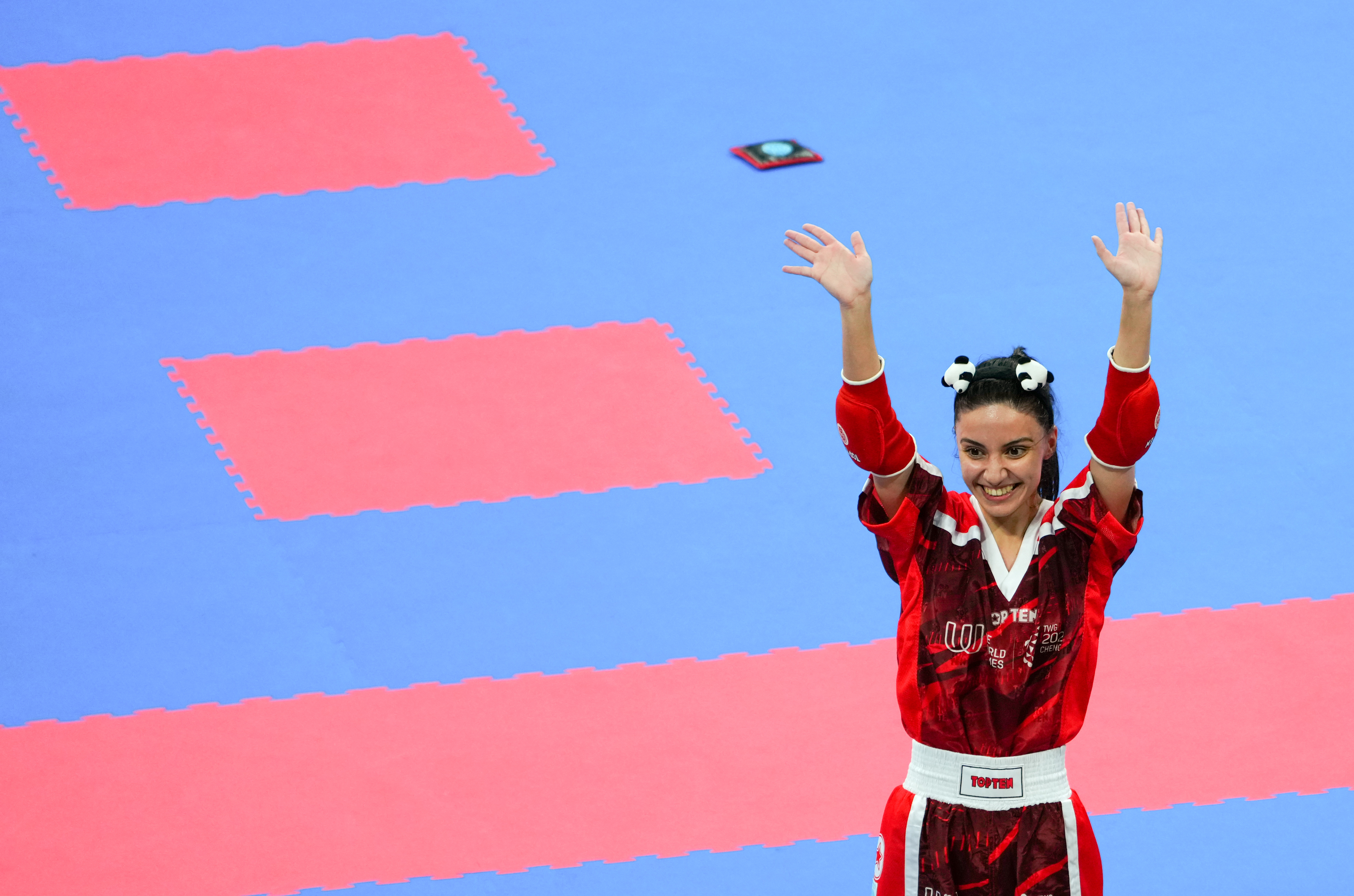 如果统计运动员的心愿清单,“看大熊猫”一定会排在第一位。来自土耳其的自由搏击女将克伦奇是名铁杆熊猫迷,她接连购买了多批熊猫纪念品,还在比赛后戴上了熊猫发卡。